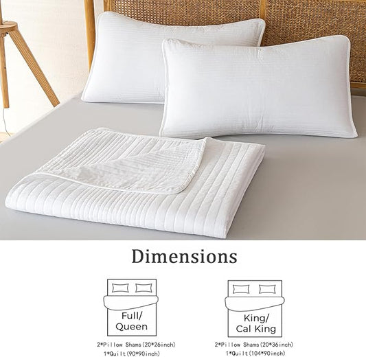 100% Cotton Queen Quilt Set 3-Piece,Lightweight and Textured Bedspread Coverlet & 2 Pillow Shams,All-Season Lightweight Queen Comforter Bedding Set(White)