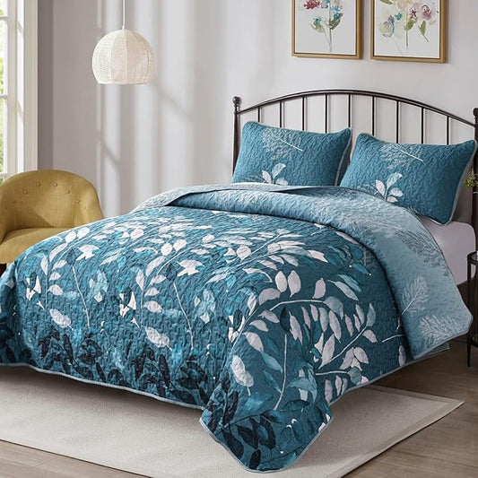 WONGS BEDDING Quilt Set Queen Size,3 Pieces Teal Floral Botanical Leaves Bedspread Coverlet Set with 2 Pillowcases for All Season, Soft Microfiber Floral Bedding Set 96"×90"