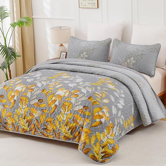 WONGS BEDDING Gold Quilt Set King Size, 3 Pieces Grey Gold Floral Bedspread Coverlet Set, Soft Microfiber Lightweight Floral Bedding Set King 104"×90"
