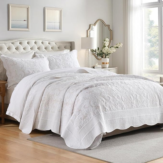 100% Cotton Queen Quilt Set 3-Piece,Bedspread Set and 2 Pillowcases, Lightweight and Textured,All-Season Lightweight Queen Comforter Bedding Set(White)