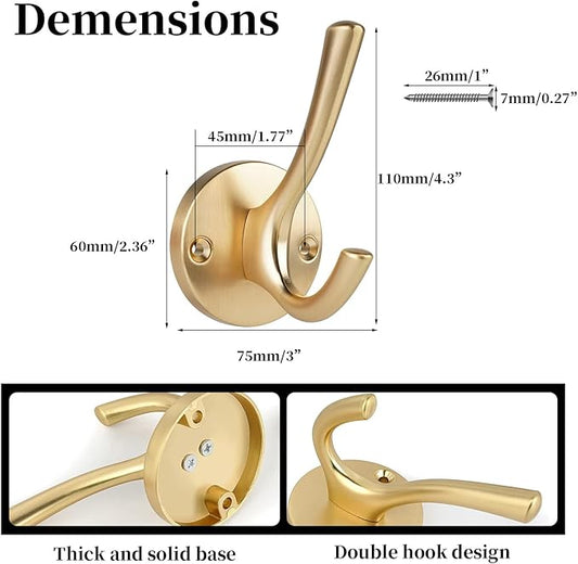 4 Packs Gold Coat Hooks, Silver Robe Hook, Decorative Towel Hooks, Heavy Duty Double Prong Wall Hooks, Metal Closet Hooks, Hat Hooks for Hanging for Bathroom, Kitchen and Office