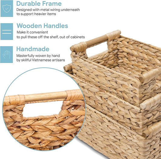 VATIMA Hyacinth Wicker Basket Set 3 size - Rectangular, Wooden Handles, Shelf Organizer, Natural Bins