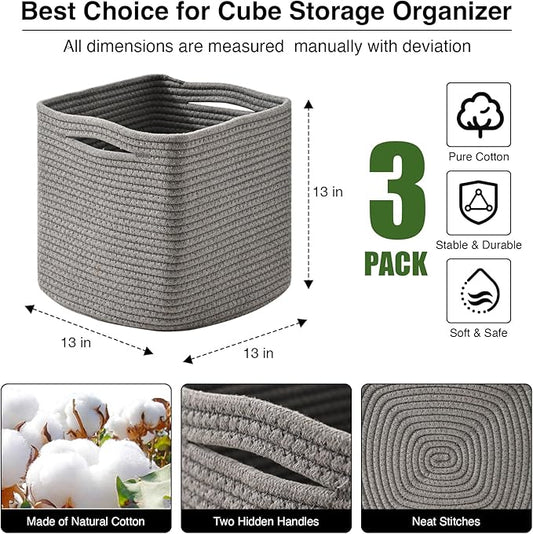 13 Inch Cube Closet Storage Bins, Woven Cotton Rope Organizer Baskets for Organizing & Shelves, Books, Towels, Clothes, Toys, 13x13x13 in, Grey (Pack of 3)