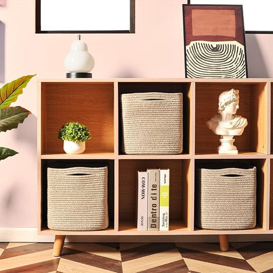 MINTWOOD Design 3-Pack Decorative Woven Storage Baskets for Shelves, Cube Bin Box for Organizing Books, Shoes, Dog Toys, Pantry Closet and Living Room Organizer, Creamy White