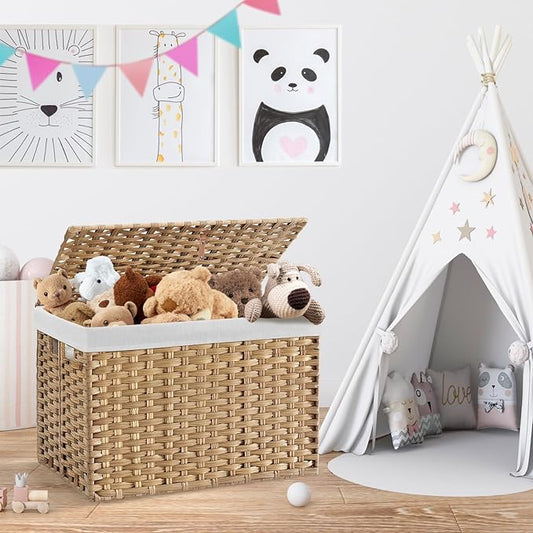 240L Wicker Storage Basket with Lid, Handwoven Rattan Large Shelf Basket with Removable Liner, 47.6 Gallon Wicker Basket for Blanket, Storage Trunk with Handle for Closet, Bedroom, Livingroom, Natural