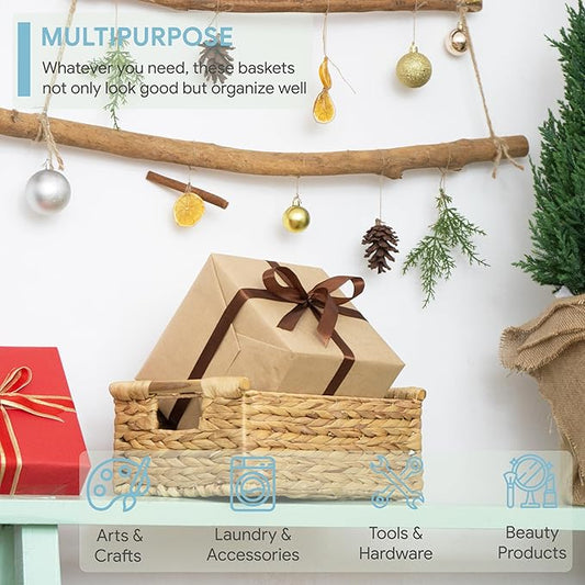 VATIMA Large Rectangular Wicker Basket with Wooden Handles for Shelves and Storage - Natural Water Hyacinth Basket for Organizing, 14.5 x 10.3 x 7.5 inches