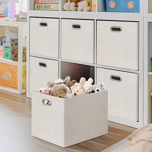 Posprica 15.12"x12.13"x12.01" Storage Cube Bins, Linen Decorative Closet Storage Organizer for IKEA Kallax, 4 Pack Fabric Foldable Large Storage Baskets for Closet, Shelves, Clothes, Toy (Beige)