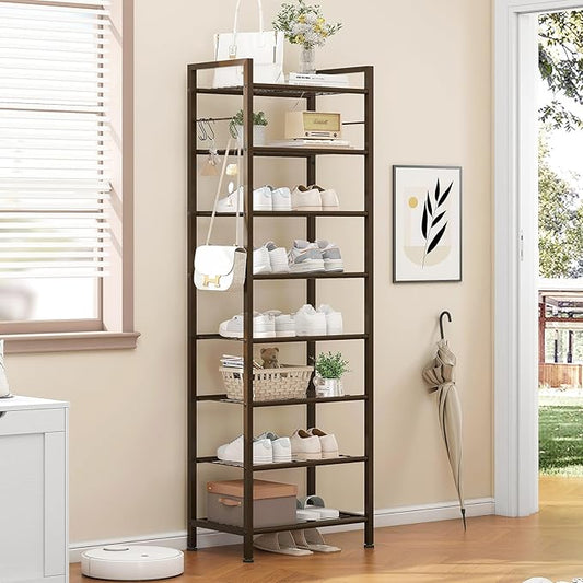 usikey 8 Tiers Narrow Shoe Rack 16-24 Pairs, Sturdy Metal Tall Shoe Rack with 4 Hooks, Slim Shoe Storage Organizer with Metal Shelf, Space Saving Vertical Shoe Shelf for Entryway, Closets, Bronze