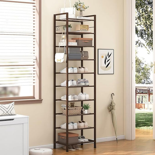 usikey 10 Tiers Narrow Shoe Rack 20-30 Pairs, Sturdy Metal Tall Shoe Rack Shelf with 4 Hooks, Slim Shoe Storage with Metal Shelf, Space Saving Vertical Shoe Organizer for Entryway, Closets,Bronze