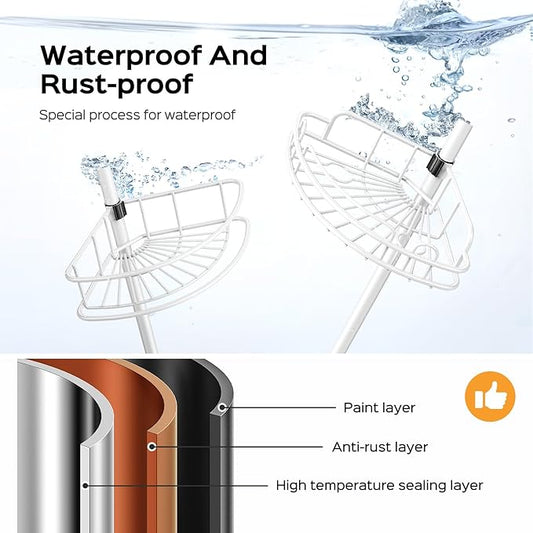 HAMITOR Corner Shower Caddy Tension Pole: Rustproof Bathroom Organizer Shelves for Bathtub Shampoo Accessories Storage Holder - 47-121 Inch Adjust - White