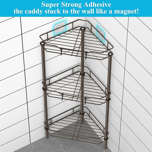 3 Tier Floor Standing Corner Shower Caddy Organizer Shelf with Hooks, Bathroom Shelves Stand Rack, Bronze