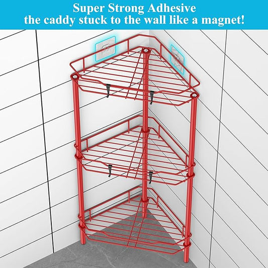 3 Tier Floor Standing Corner Shower Caddy Organizer Shelf with Hooks, Bathroom Shelves Stand Rack, Red