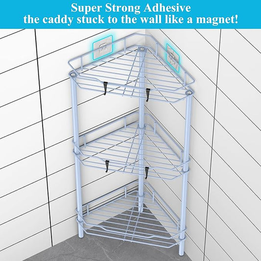 3 Tier Floor Standing Corner Shower Caddy Organizer Shelf with Hooks, Bathroom Shelves Stand Rack, Blue