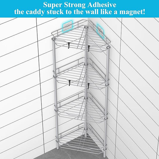 4 Tier Floor Standing Corner Shower Caddy Organizer Shelf with Hooks, Bathroom Shelves Stand Rack, Silver