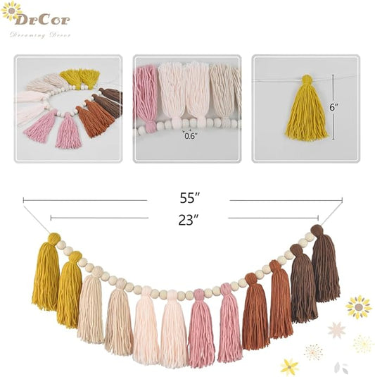 DrCor Boho Pink & Sage Green Tassel Garland – Soft Pastel Wall Hanging for Nursery, Kids Room or Dorm, Baby Shower, Birthday Party Backdrop, or Cozy Fall Home Decor