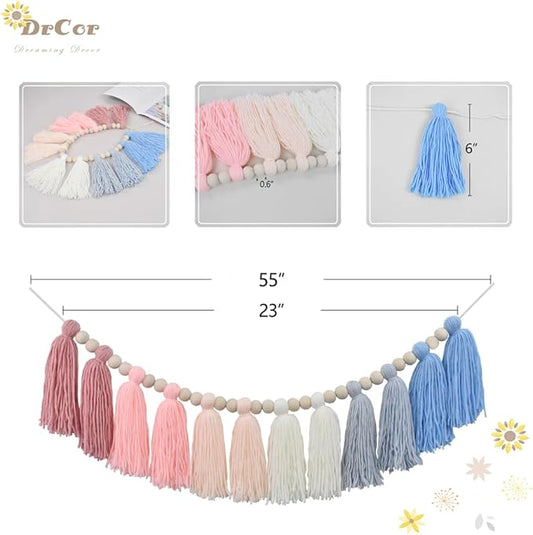 DrCor Pink & Blue Boho Tassel Garland – Preppy Coastal Yarn Wall Hanging with Wooden Beads for Nursery, Kids Room, Baby Shower, Gender Reveal Party, Birthday Backdrop or Coastal Home Decor