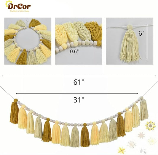 DrCor Sunshine Yellow Boho Tassel Garland – Fall Mustard Classroom Banner, Thanksgiving Party Backdrop, Preschool Wall Decor, Sunflower Birthday or Baby Shower Decoration