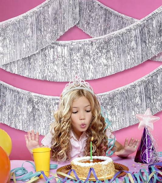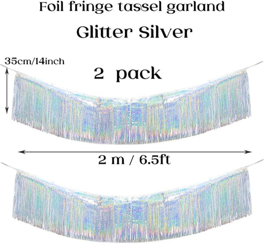 Premium Silver Fringe Tinsel Garland for Party Decorations -4 Layers Thick, 2 Pack | LILF Foil Metallic Tinsel Banner Party Streamers for Wedding Birthday Christmas Decoration Home Hanging Decor