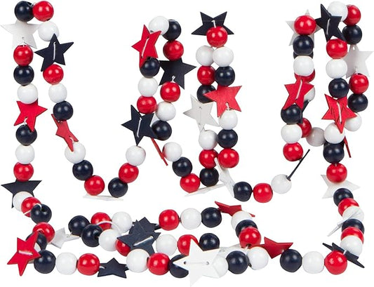 One Holiday Way 9 Foot Decorative Red White and Blue Wood Bead Garland with Wooden Stars – Vintage Patriotic July 4th Decoration Rustic Americana Home Décor