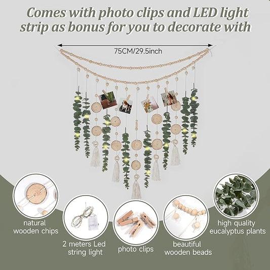 Artificial Hanging Eucalyptus Wall Decor Fake Greenery Leaves Wall Hanging Plants on Long Wooden Beads Garland Wall Art Large Boho Rustic Farmhouse Decor for Bathroom Bedroom Living Room Sage Green