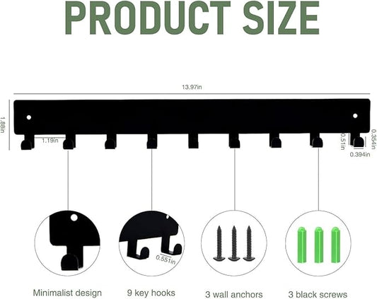 Key Holder Wall Mounted with 9 Hooks, Metal Key Organizer Rack, Black Key Hanger for Entryway, Kitchen, Living Room, Office, Doorway Decor (14 Inches)