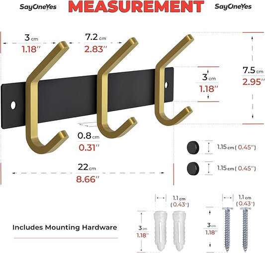 Small Coat Rack Wall Mount – Black and Gold Hook Rail with 3 Double Coat Hooks, 9 Inch Stainless Steel Wall Hooks for Entryway, Bathroom, Bedroom, Closet, Towel, Hat, Bag, Heavy Duty Organizer