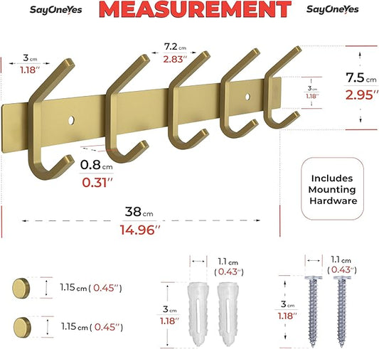 Brushed Gold Wall Mounted Coat Rack – 15 Inch Stainless Steel Rail with 5 Double Coat Hooks for Entryway, Bathroom, Bedroom, Kitchen – Modern Gold Hook Rack for Coats, Hats, Towels