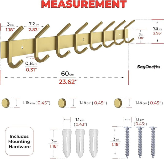 Brushed Gold Wall Mounted Coat Rack – 24 Inch Stainless Steel Rail with 8 Double Coat Hooks for Entryway, Bathroom, Bedroom, Kitchen – Modern Gold Hook Rack for Coats, Hats, Towels