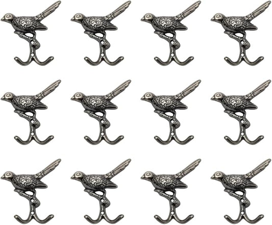 12 pcs Antique Silver Bird Decorative Wall Hooks for Hanging Coats, Keys, Towels, Bags, and More