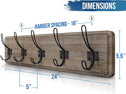 HBCY Creations Weathered Rustic Coat Rack Wall Mount with 5 Hooks, Solid Pine Wood 24 inch Wall Hooks for Entryway, Mudroom, Hallway, Bathroom - Vintage Farmhouse Style Wall Mounted Towel Rack