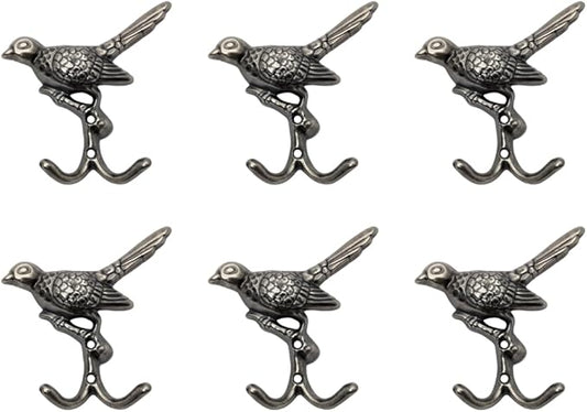 6 pcs Antique Silver Bird Decorative Wall Hooks for Hanging Coats, Keys, Towels, Bags, and More