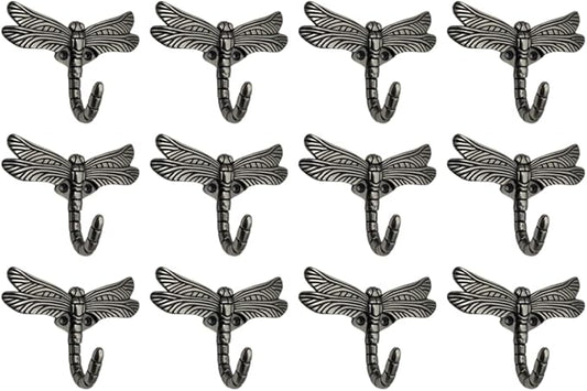 12 pcs Antique Silver Dragonfly Decorative Wall Hooks for Hanging Coats, Keys, Towels, Bags, and More