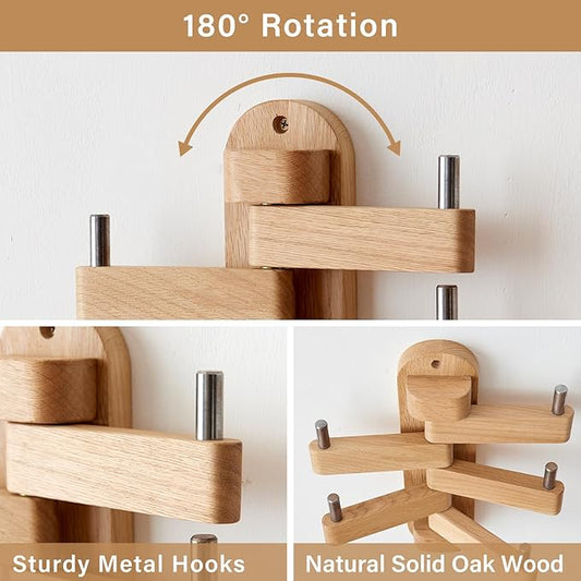 Oak Coat Hook Swivel Wall Rack, Foldable Arms 5, 12" Length Hat Hooks for Bedroom Office Kitchen, Heavy Duty (Natural)