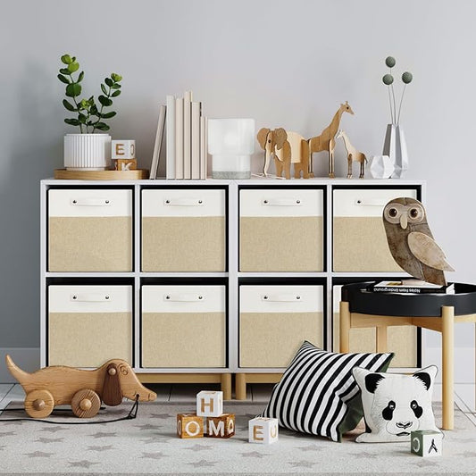 13 x 13 Inch Fabric Storage Cube Bins, 4 Pack Fine Linen Storage Boxes with Handles, Collapsible Basket Organizers for Shelves (White/Khiki)
