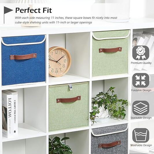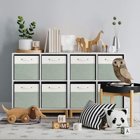 13 x 13 Inch Fabric Storage Cube Bins, 4 Pack Fine Linen Storage Boxes with Handles, Collapsible Basket Organizers for Shelves (White/Green)