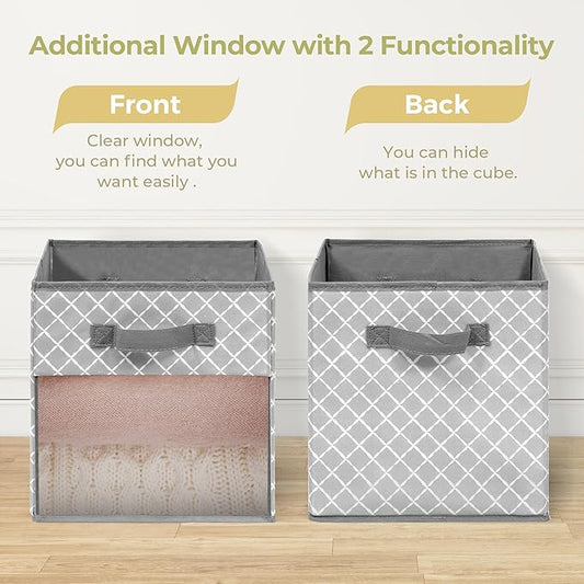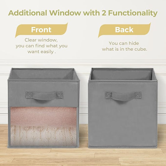 Storage Bins with Clear Window, 11x11 Storage Cubes, Collapsible Cube Storage Box, Fabric Closet Organizers with Handles for Home, Office, Shelf, Closets, Living Room, Grey, 6 Pack