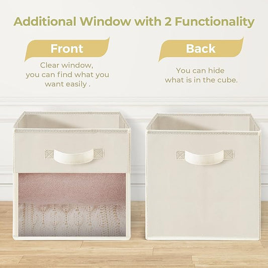 Storage Bins with Clear Window, 11x11 Storage Cubes, Collapsible Cube Storage Box, Fabric Closet Organizers with Handles for Home, Office, Shelf, Closets, Living Room, Beige, 6 Pack