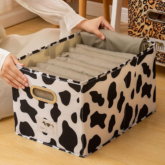 ANMINY Fabric Storage Bin Cow Print Cotton Linen Foldable Open Storage Basket Box with Handles PP Plastic Board Label Window Decorative Washable Desktop Closet Shelf Organizer Container - Medium