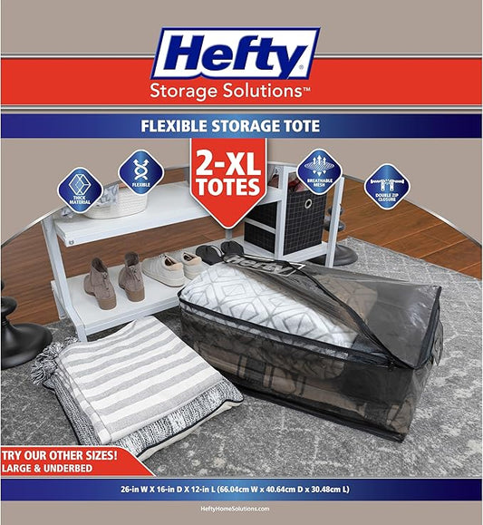 Hefty Large Flexible Tote with Breathable Mesh, Double Zipper, 2 Handles – Ideal for Moving or Clothes & Apparel Storage, Alternative to Plastic Bin, Organizer or Container – 2 Pack