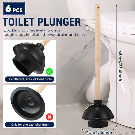 Dandat 6 Pcs Rubber Toilet Plunger with Double Thrust Force Suction Cup Long Wooden Handle Toilet Bowl Plunger Heavy Duty Pump Clogged Solution for Bathroom Stores Restaurants, Black