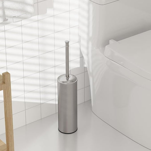 BESy Toilet Brush and Holder, Toilet Cleaner Bowl Set with Two Brush with Extra Long Handle, Durable Bristles Toilet Scrubber and Covered Holder, Drip-Proof Stainless Steel Brushed Nickel