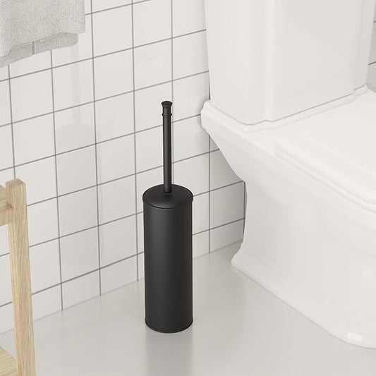 BESy Toilet Brush and Holder, Toilet Cleaner Bowl Set with Two Brush with Extra Long Handle, Durable Bristles Toilet Scrubber and Covered Holder, Drip-Proof Stainless Steel Matte Black
