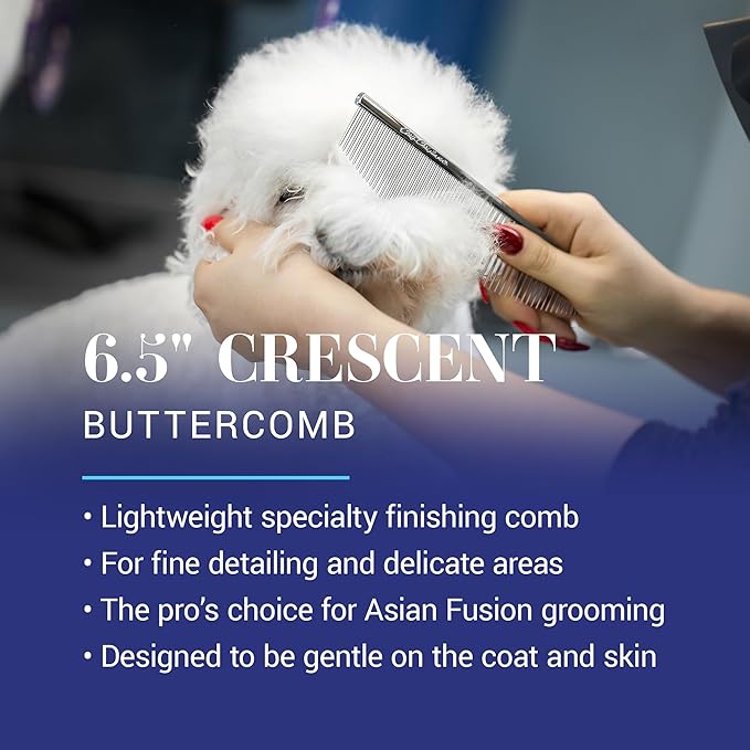 - CREATE ROUND SHAPES – the Crescent Buttercomb is a key tool in Asian Fusion or Asian Freestyle grooming. Its shape makes it simple to get into tight spots and fluff out all of the hair, making it much easier to scissor round faces. It also sets and lifts the hair, helping to create the signature fluffy, rounded "teddy bear" or "cute" faces. Perfect for Poodle or Doodle owners.