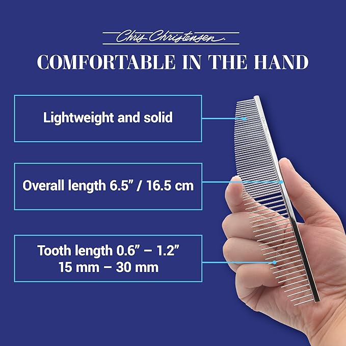 Chris Christensen 00C 6.5 in Crescent Coarse/Fine Finishing Butter Comb, Groom Like a Professional, Rounded Corners Prevent Friction and Breakage, Solid Brass Spin with Steel Teeth, Chrome Finish