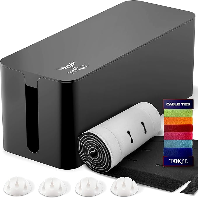 - Cable Organizer Box: Our cable management box black is a streamlined, discreet design, used as a cord hider box and wire organizer. Loose wires create confusion, can get damaged, and look unsightly. Solve all your problems at once with a Tokye cord organizer.
