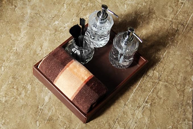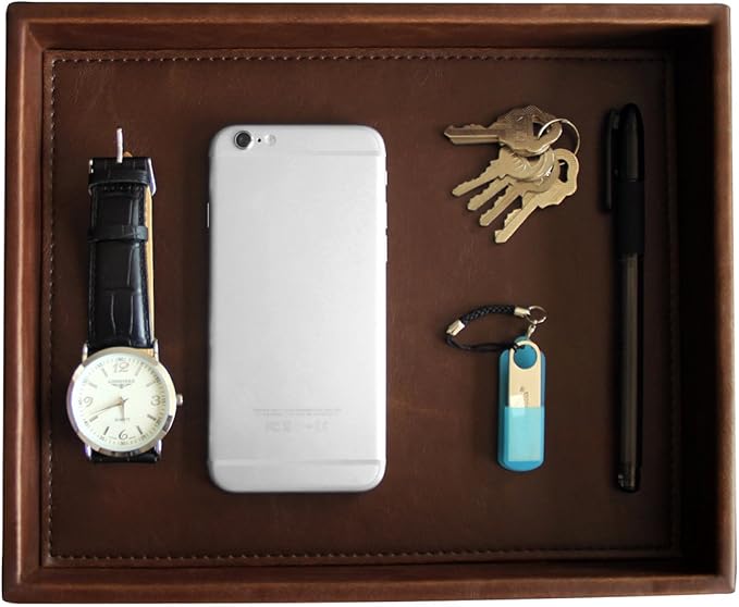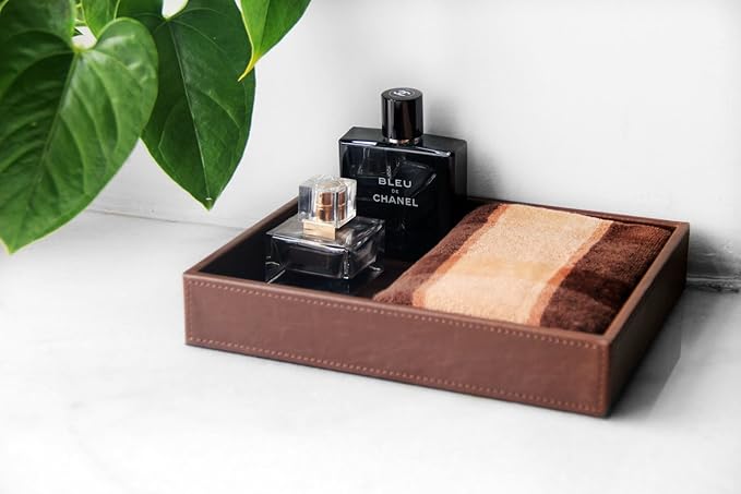 HofferRuffer Decorative Vanity Tray, Desktop Storage Organizer, Catchall Tray, Valet Tray, Nightstand or Dresser Organizer, PU Faux Leather Bathroom Tray, Brown, 10.2 x 8.4 x 1.8 inches