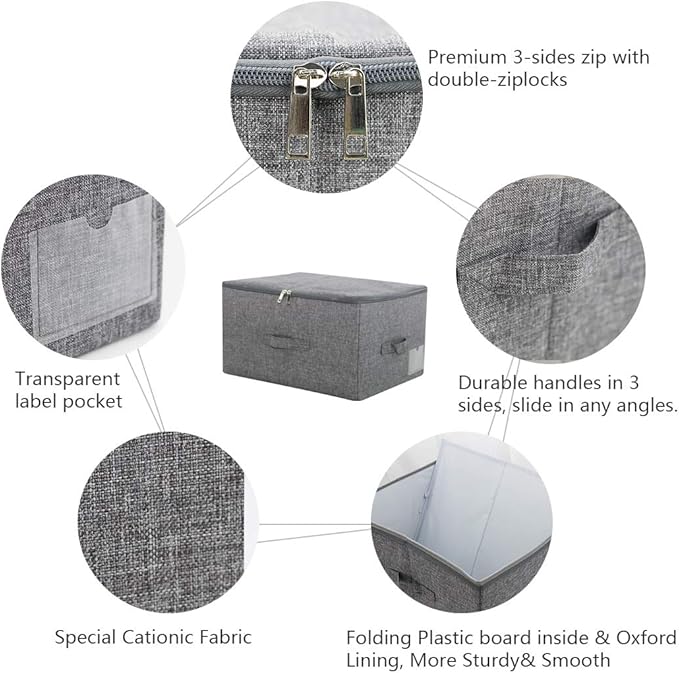 - Good Materials for each parts---This Storage box is made of breathable linen, thick PP plastic board inside. Three-side Open with Double side zippers, Convinient for take out/ put in items. There are three handles on front and sides in total, you are easily to slide it in any angles. It has good durability, longevity and better strength.