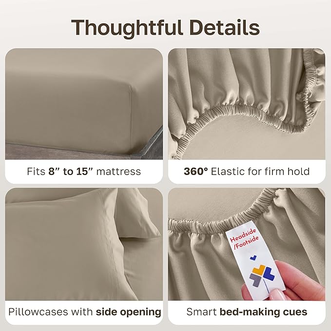 - About this Shade & Set: This cool taupe shade is a soft, warm taupe with beige undertones– it is not cool or grey. 3 Piece twin sheet set includes 1 flat sheet (66" W x 100" L) with 4" hem; 1 deep pocket fitted sheet (39" W x 75" L) with all-around elastic grip to fit mattress 8 to 15" for a secure fit; 1 standard / queen size pillowcase (21" W x 32" L) with classic open-end design. Top/Bottom tags simplify bed making.