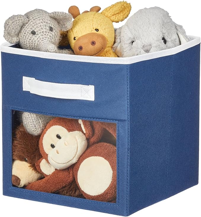 - CLEAR WINDOW: The see-through window allows you to view contents without having to pull the bin from its stored location; The attached handle makes it easy to move bins on and off closet shelves; Boxes are collapsible for convenient and compact storage when not in use; There is a sturdy reinforcement that goes inside the base for added stability and support; Use together in a larger furniture unit, on shelves or individually; Find a multitude of uses for these fun and fashionable storage bins