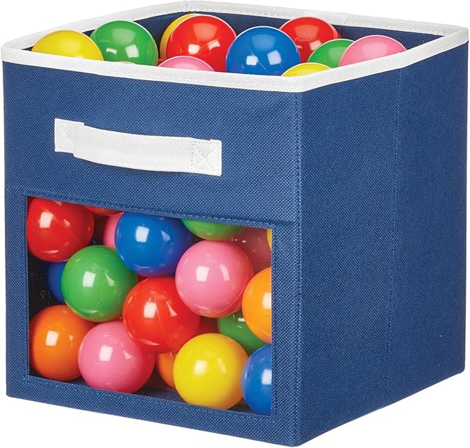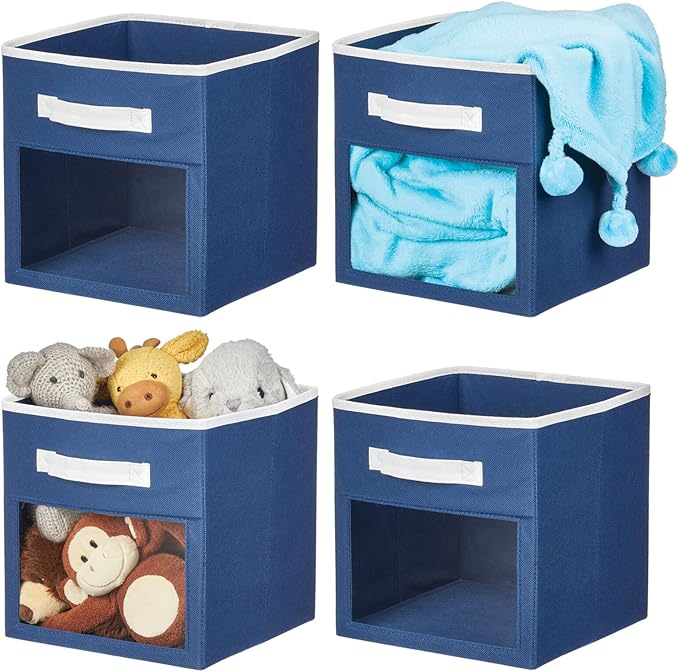 mDesign Fabric Nursery/Playroom Closet Storage Organizer Bin Box with Front Handle/Window for Cube Furniture Shelving Units, Hold Toys, Clothes, Diapers, Bibs, Jane Collection, 4 Pack, Navy Blue/White